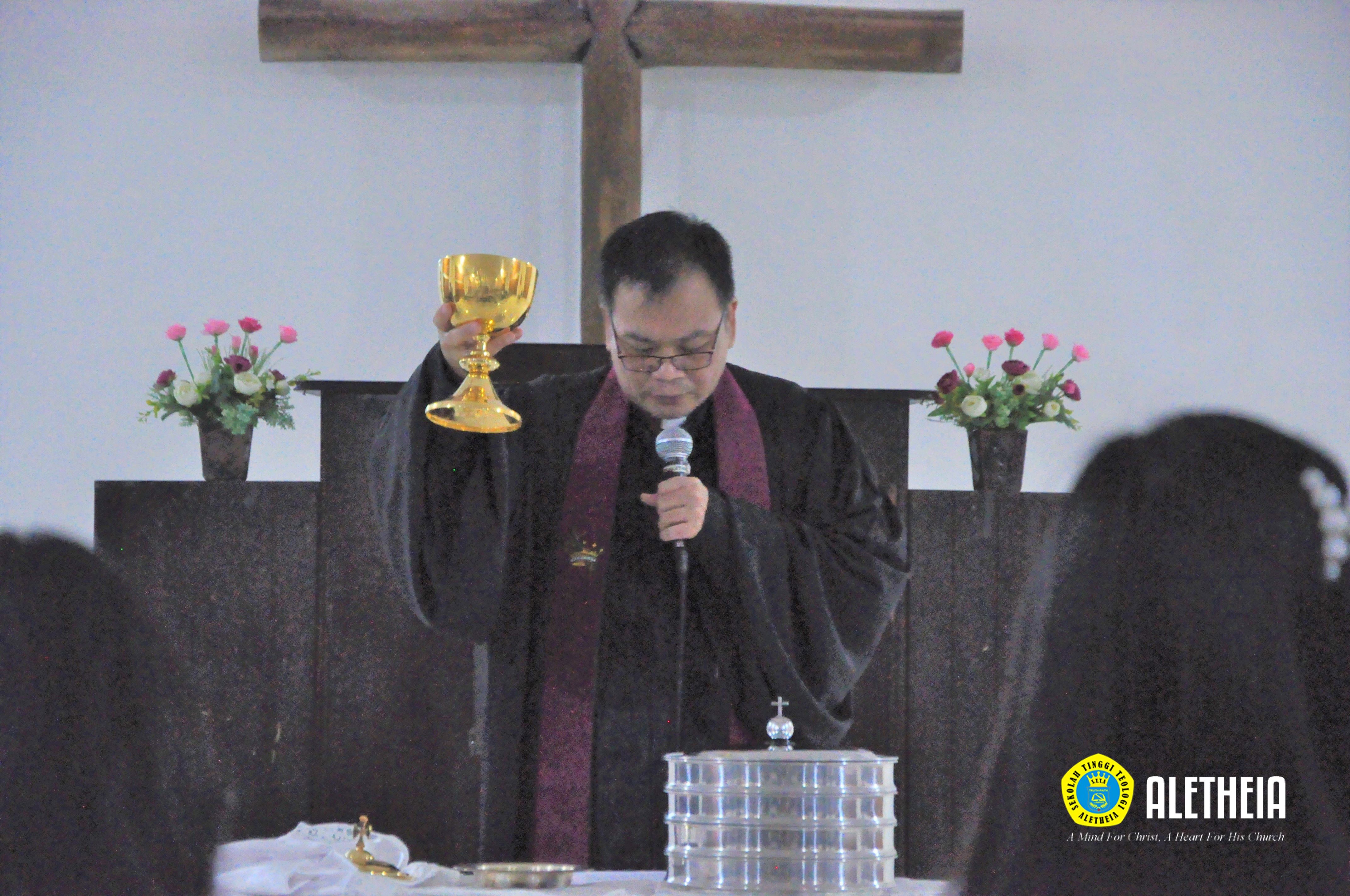 Ketua STT Aletheia, Pdt. Amos Winarto, Ph.D. melakukan prosesi pembasuhan kaki