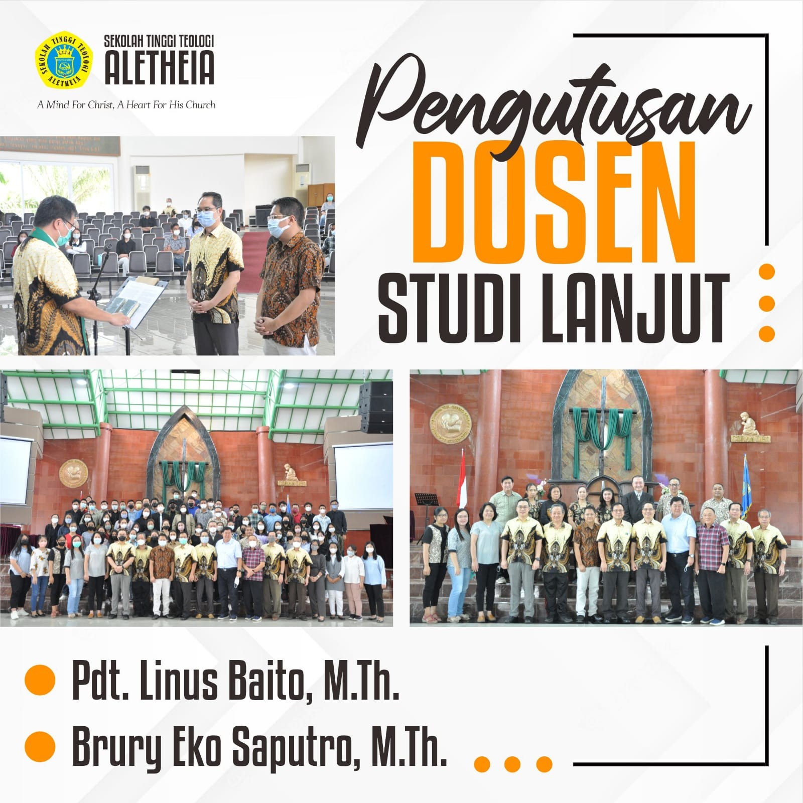 Upgrading kualifikasi dosen sangatlah penting dalam peningkatan kualitas sebuah lembaga Pendidikan tinggi. Selain dapat meningkatkan nilai akreditasi sekolah, upgrading kualifikasi dosen juga akan meningkatkan kualitas pengajaran dan penelitian. Karena itu, pada hari Selasa, 27 September 2022, pkl. 09.20 wib di auditorium Sola Gratia bersamaan dengan dilangsungkannya ibadah Chapel Selasa, STT Aletheia mendukung dan mengutus dua dosen, yaitu Pdt. Linus Baito, M.Th. dan Brury Eko Saputra, M.Th. untuk studi lanjut.