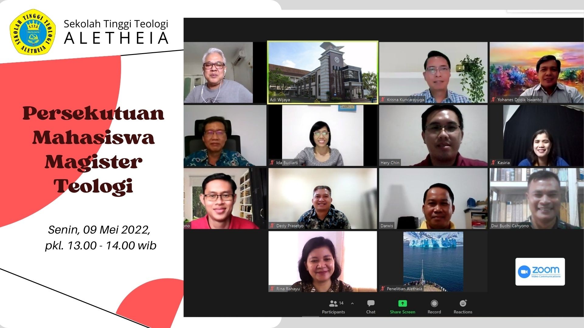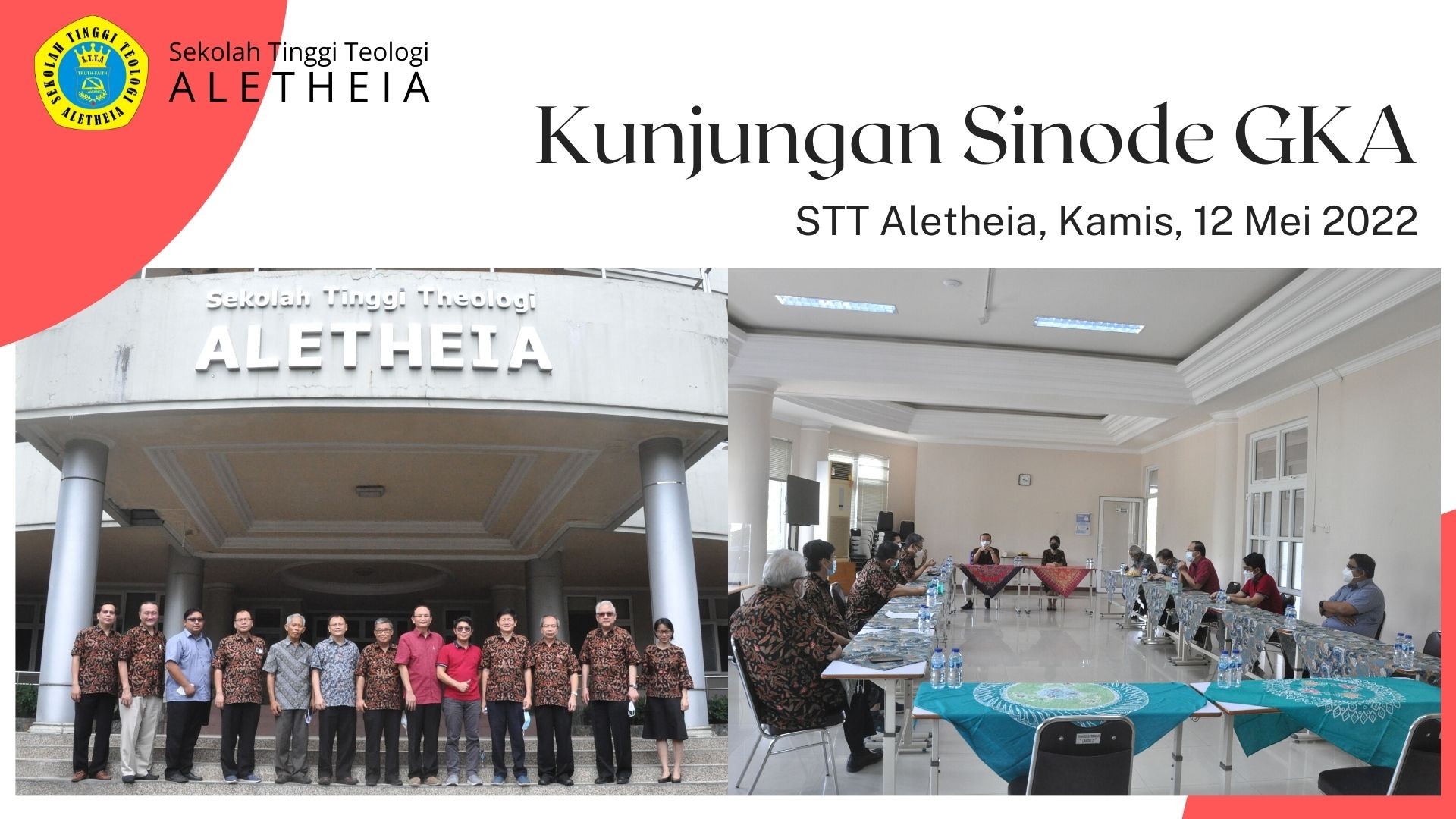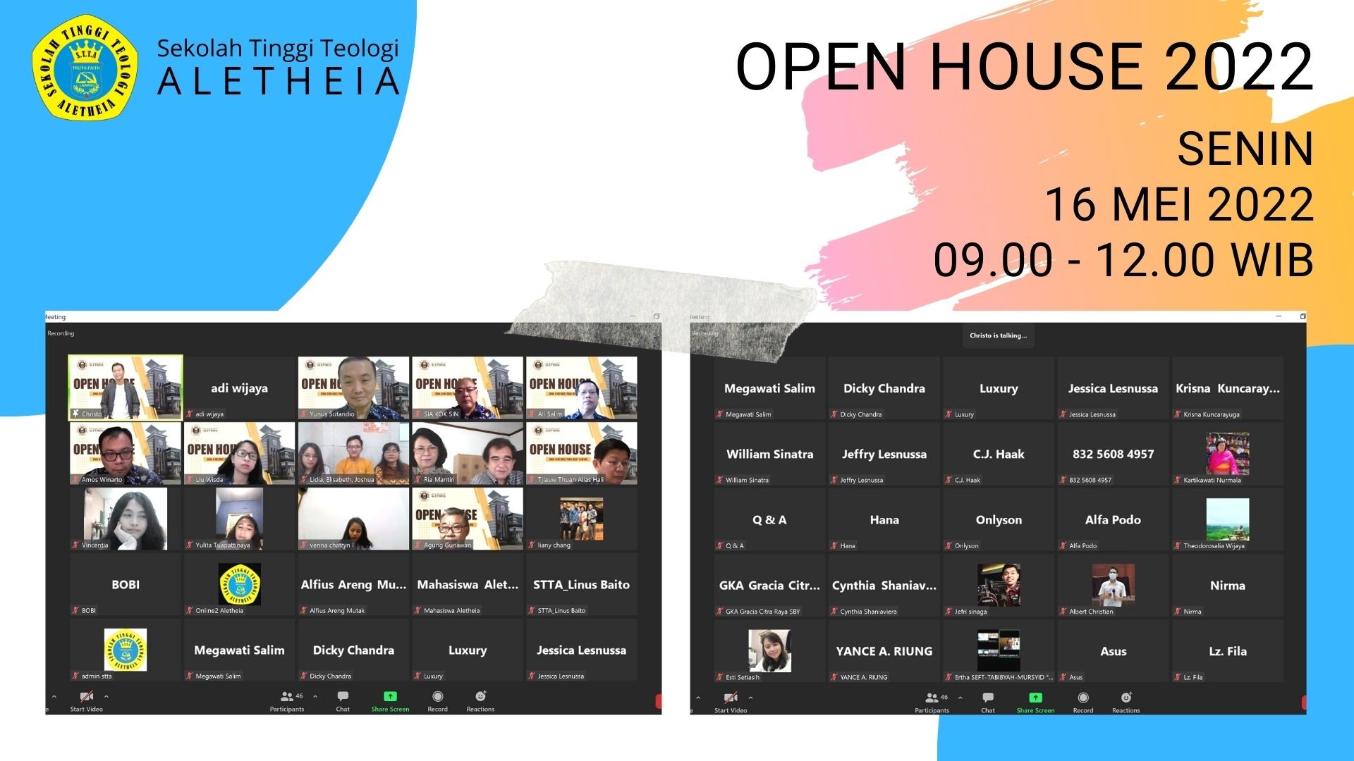 Setelah selama 2 tahun ditunda karena pandemi covid 19, maka pada hari Senin, 16 Mei 2022, pkl. 09.00 wib – selesai, STT Aletheia kembali mengadakan acara OPEN HOUSE secara daring. Open House merupakan acara yang diselenggarakan STT Aletheia untuk memperkenalkan pada gereja-gereja tentang identitas, visi misi, para dosen dan mahasiswa, serta kegiatan mahasiswa STT Aletheia. Acara ini bertujuan agar gereja-gereja dan masyarakat umum semakin kenal dengan STT Aletheia. Acara ini juga merupakan bentuk promosi STT Aletheia pada peminat-peminat calon mahasiswa sehingga mendongkrak jumlah pendaftar Program Studi Sarjana Teologi dan Magister Teologi.