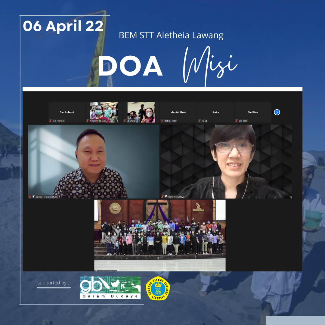 Badan Eksekutif Mahasiswa (BEM) STT Aletheia Lawang bekerjasama dengan Yayasan Garam Budaya (Surabaya) telah mengadakan Malam Doa Misi untuk beberapa suku di Indonesia. Malam Doa Misi tersebut diselenggarakan secara hybrid (luring dan daring) pada hari Rabu, 06 April 2022, pkl. 19.00 wib – selesai. Secara luring, acara dipusatkan di Auditorium Sola Gratia dan secara daring dengan menggunakan aplikasi zoom meeting.