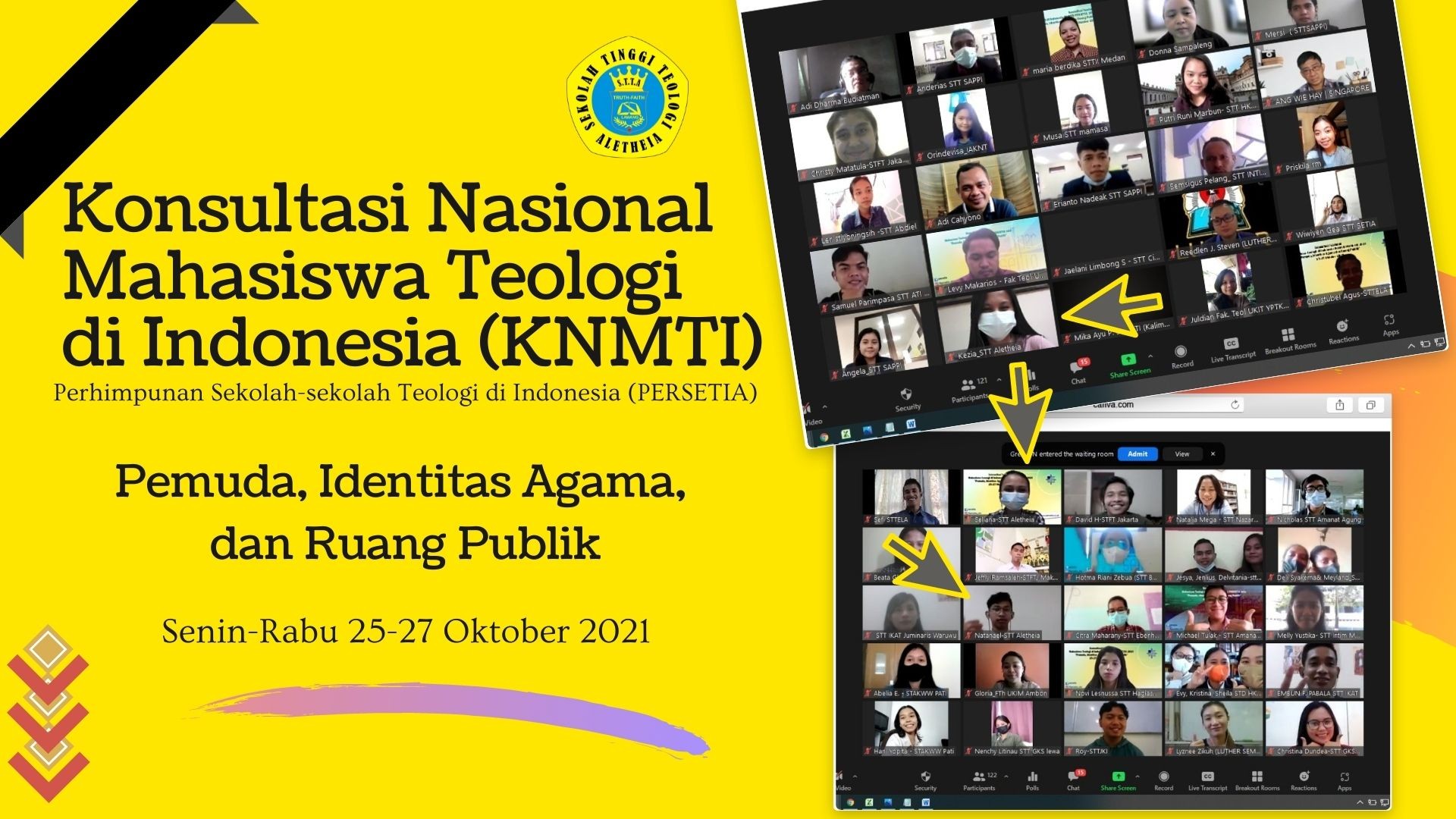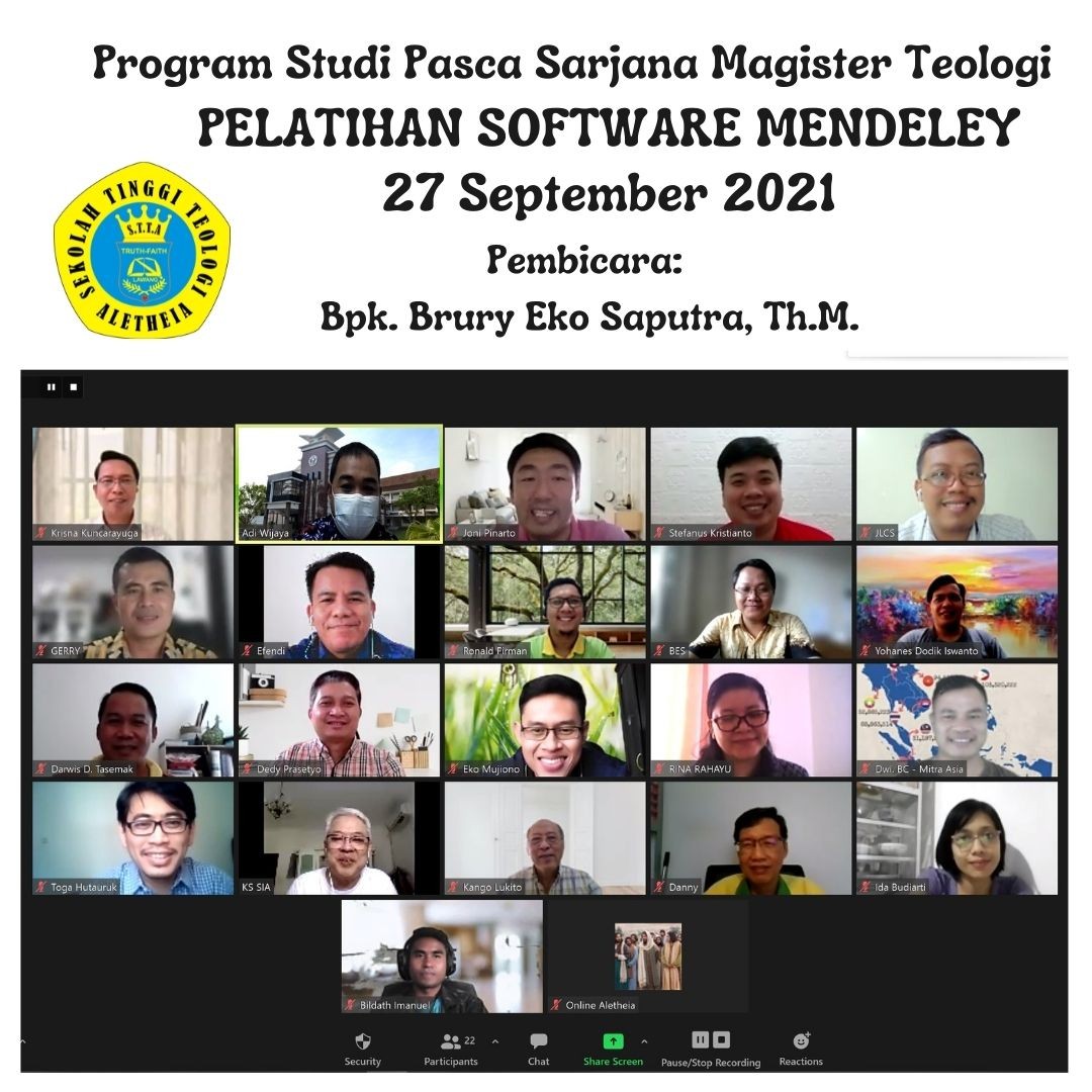 Sebagai salah satu anggota yang aktif dalam organisasi PERSETIA (Perhimpunan Sekolah-sekolah Teologi di Indonesia), STT Aletheia Lawang mengutus Sdri. Seliana, Sdr. Natanael Tri Melyanto, dan Sdri. Kezia Ivanna Maramis (ketiganya merupakan mahasiswa semester 5) untuk menghadiri Konsultasi Nasional Mahasiswa Teologi di Indonesia (KNMTI), Senin-Rabu 25-27 Oktober 2021 secara daring (Zoom Meeting) dengan tema Pemuda, Identitas Agama, dan Ruang Publik.