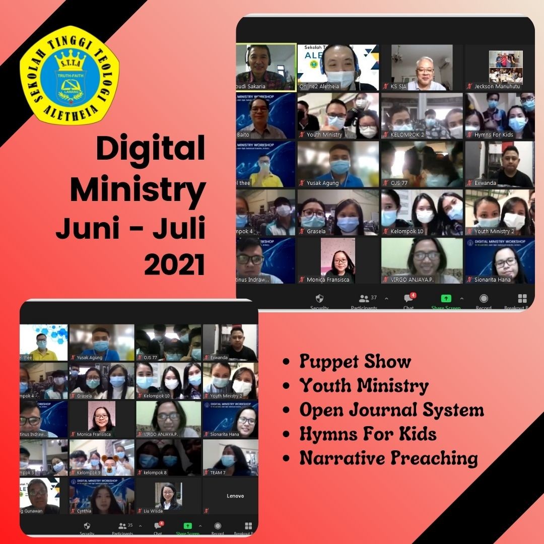 Pelatihan Digital Ministry juga boleh diikuti oleh seluruh mahasiswa berlangsung pada tanggal 07-10 Juni 2021, 14 Juni 2021, 16 Juni 2021 dan 2 Juli 2021 dengan berbagai pelatihan yang membekali keterampilan pelayanan yang berbasis digital bagi mahasiswa STT Aletheia Lawang.