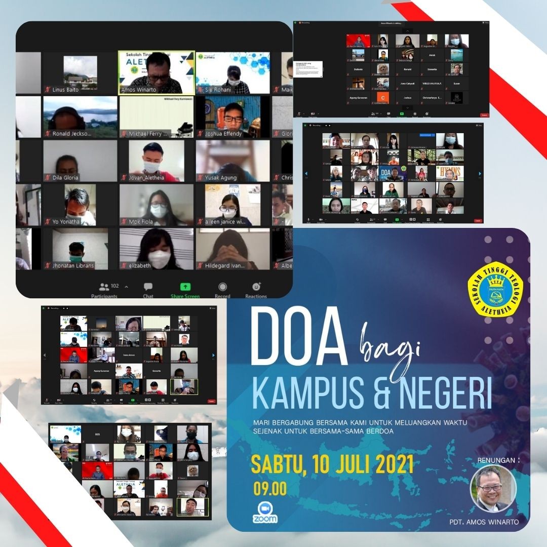 STT Aletheia, pada hari Sabtu, 10 Juli 2021, pkl. 09.00 wib - selesai secara daring menggelar acara Doa Bagi Kampus & Negeri dengan pembicara Pdt. Amos Winarto, Ph.D. Beliau dalam nats Alkitab yang diambil dari Markus 9:14-29 bahwa doa yang sungguh-sungguh pasti akan didengarkan oleh Tuhan, dan beliau juga menjelaskan tentang penghalang doa, antara lain: Tidak fokus, ragu-ragu (kurang yakin), putus asa karena mengharapkan hasil yang tidak kunjung terlihat, dan karena gangguan Iblis.